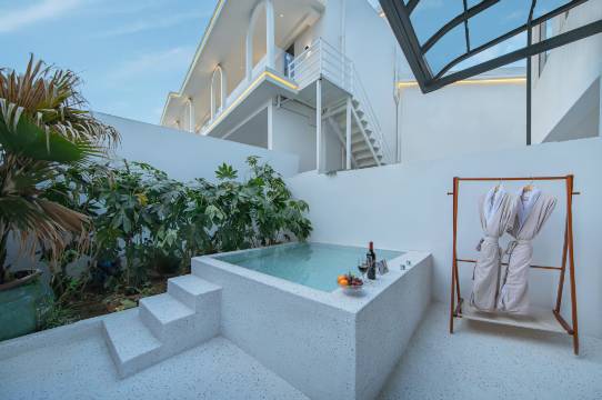 线描房间很大,有懒人沙发可以躺,大落地窗可以直接看到院子,满眼绿色尽收眼底,治愈系度假。房间还有一个超大浴缸,第二晚下雨就没出门,选择了和娃一起躺在浴缸里,很神奇泡了一小时水还是温的,孩子也玩的很尽兴!