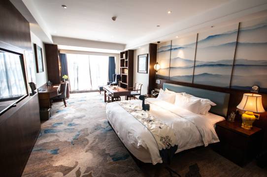 酒店整体设计是将唐代古典建筑风格与唐山老手工艺术品完美结合,营造宏达、禅静的氛围。酒店客房内设有全智能化感应设备,一键完成灯光照明、窗帘开关等功能,另外,全部客房内装有boss音响,随时可以与手机、各种多媒体设备连接,收听自己喜爱的音乐,卫生间玻璃更是采用智能雾化功能,完美的将卫生间与卧室分隔遮挡。所有房间内还配有空气净化器、可视门禁、咖啡壶、茶道用品、熏香、古典文化书籍等,新中式装修风格到处都充满着文化气息。