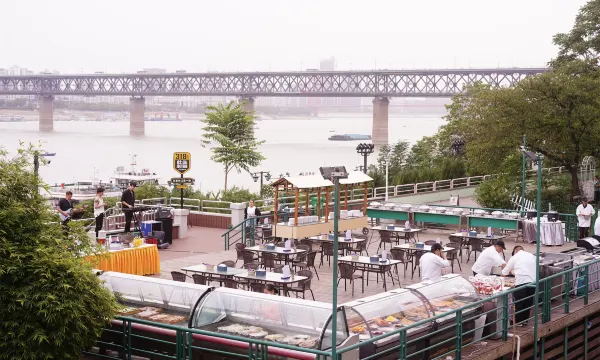 江景如画的江畔露台可一览武汉长江大桥、晴川阁、黄鹤楼、武汉灯光秀等武汉特色,在樱花飞舞的春季以及气候宜人的秋季为您带来融合中西方荟萃菜肴的自助晚餐及任君选择品种繁多的现场烧烤食品。放慢脚步,远离都市的喧嚣,享受只属于你的静谧时光。