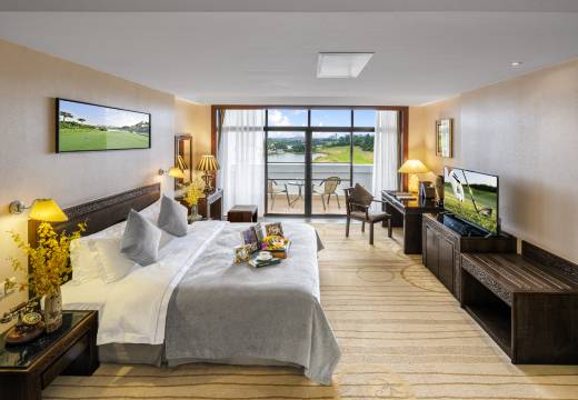 开有年份的酒店,现在分批在重装修,期待重装修后的遇见。高尔夫球房风景是不错的,估计这栋还没装重装,拍出来房间照片有宽度但地板还没亮度,桌台面也有年份了。酒店餐厅早餐到10点了,建议中午也可以开个供打球人亲民价格的简餐自助哦。外景图来自房间阳台观景