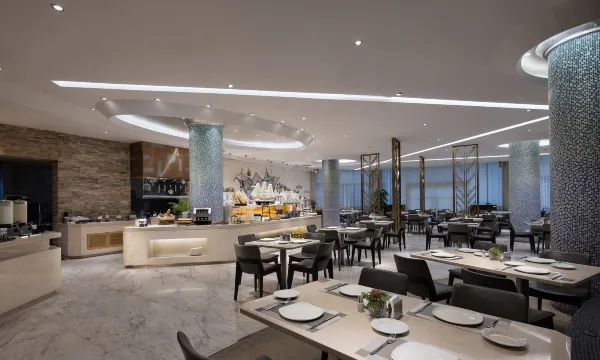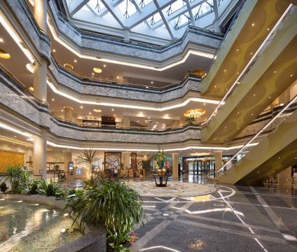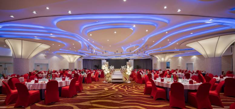 酒店大宴会厅,面积900平方米,能够接待多至600人的大型会议。拥有电脑投影仪、宽带互联网、智能场景氛围灯光等先进的会议及宴会设施。场地灵活多变,装饰别具特色,能满足学术研讨、商务会议、私人宴请、婚礼庆典及国际大型活动等各类接待需求。