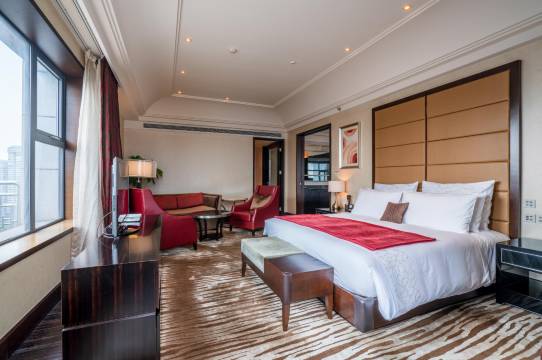 贵宾楼室内设计由全球HBA公司负责,拥有不同类型的客房两百余间,宽幅隔音玻璃窗让您远离都市喧哗,静享锦江美景;房间内豪华时尚家俱、超宽床具配以美国“丝涟”品牌加厚床垫、80*60纱织面料的豪华床上用品、羽绒枕头和盖毯,42寸平板电视、带有Iphone机座的JBL音响、使用的德国“Kafee”咖啡机、客房区域无线网络的全覆盖。阔大的大理石浴室、内置15寸平板电视。24小时的管家服务将为您提供包括行李开箱、打包,餐食、本地日程安排等专属服务,全天候照顾宾客需求。
