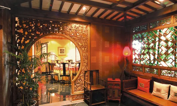 酒店大堂内有老北京大户宅院特有的素色砖雕大影壁,更有两千多件来自中国百年前的门扇和家具,从摆设到字画都显出古典的雍容华贵。