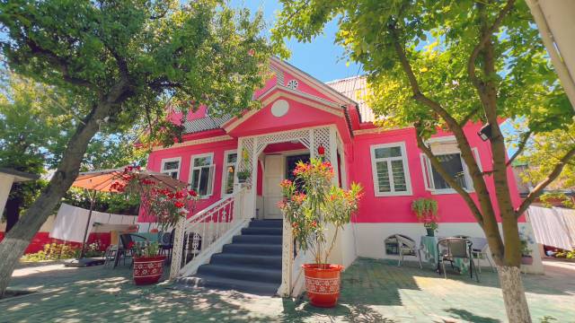 粉红色的房子温馨怡人,花果满园。