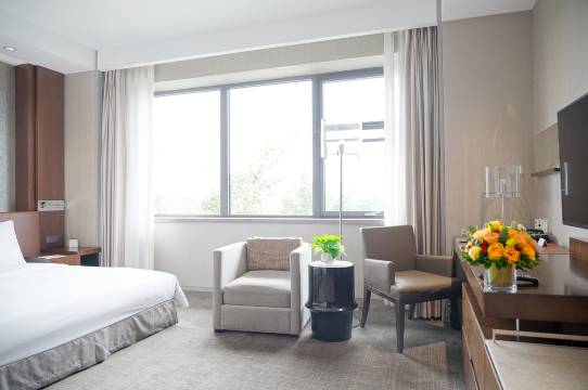 套房很宽敞,房间干净整洁,茶几上水果盘就有两盘,冰箱里有免费饮料,床垫可调节,床上还有送的耳塞眼罩等。还送了晚餐定食套餐,美味又有营养,另外加点的菜还主动给我们打了九折。高考当天下大雨,酒店工作人员比家长还要用心,七点不到就在门口准备了瓶装水,备用雨伞,还有大巴接送。在酒店大堂、走廊里碰到的每一个工作人员和保洁员都会主动微笑打招呼,大堂驻唱的歌手看到我们还热情地招手致意,让人心里暖暖的。强烈推荐给以后在华二参加考试的考生家长们,这里是最棒的选择。