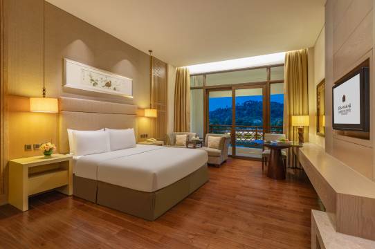 武夷山大红袍山庄是建发旅游集团旗下豪华度假型酒店,紧邻武夷山国家公园,座落山林中山水环绕、风光绰约。占地660余亩,拥有豪华别墅式客房,3000多平米的多个宴会及会议场地包含挑高7米的800平方米的多功能无柱宴会厅以及自助餐厅、中餐厅、游泳馆、网球馆、茶艺室、棋牌室、健身房等设施。