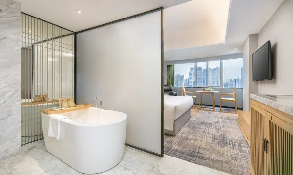 酒店楼高22层,以温泉健康环保“全竹制”打造,清新淡雅、时尚简约。置身其中更能体会古人“宁可食无肉,不可居无竹”的高雅情怀。