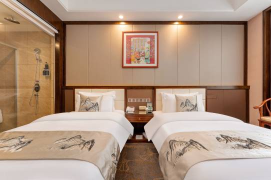 中式风格的客房装修,整体不错。前台人员很热情,有需求能及时给解决,给升级了房间,房间干净卫生也很宽敞,床都是红木的。房间物品配的也挺全,还给送了水果,关键是配了4瓶水,对于爱喝水的我也足够喝了。早餐也不错,品种很多,面条混沌馅饼都是现场制作的口味很好。