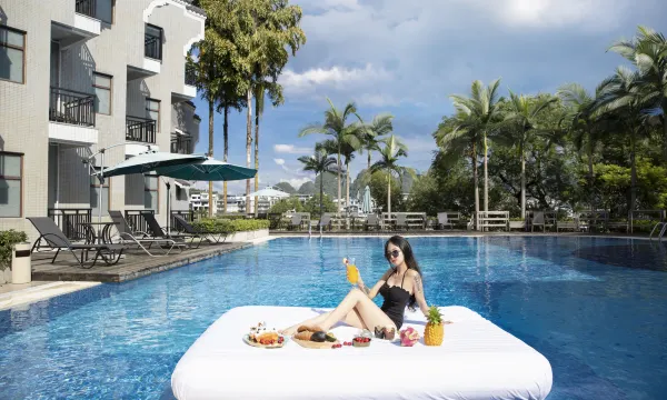 服务态度很好,体验感很不错。入住有饮料赠送,原本只有2份,我们人多还是按人头给了5份饮品券,看我们带了3个孩子也主动送来3份儿童用牙刷和拖鞋。两大三住进去是稍微拥挤了点~😜游泳池免费还分了儿童池,孩子去游了好几次。住了两个晚上,出去玩回来房间也帮我们及时收拾干净,一进去孩子们都说好干净整洁,服务真好。入住也说了晚上有晚安粥可以喝,我们不需要就没去吃。还有电动车可以租40元一天,车子很新好骑。出去转转和坐竹筏都很方便。