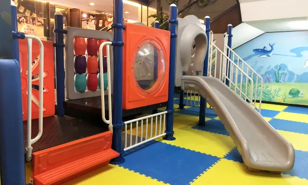 家庭套房窗外就是奥帆中心,躺在床上能看到部分灯光秀。住宿的两天正好下雨,前台很贴心提醒我们每间房的伞可以使用,还有自助洗衣烘干间。保洁韦阿姨看到小朋友光脚乱跑,很暖心送上小拖鞋,很亲切友好~(登记时前台已经给了宝宝拖鞋和洗漱用品,奈何孩子脱鞋速度飞快,已经来不及回房间拿)早餐青未了餐厅前有个滑滑梯,家长看起来觉得小小旧旧的,但是孩子真的超爱!海洋主题的卡通墙面玩乐中别有一番乐趣。