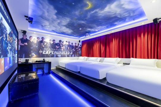 有戏的每一寸土地都经过酒店的专业设计,没错,就是你脑海中乌托邦的样子。这是一家以电影酒店为主题,同时结合电影衍生品产业的社交空间以及主题电影院的创意文化综合体。酒店客房就是您的私人电影院,133-200寸的超大高清屏幕,上千部优质片源,发烧级5.1环绕音响,让您沉浸在电影的时光里。