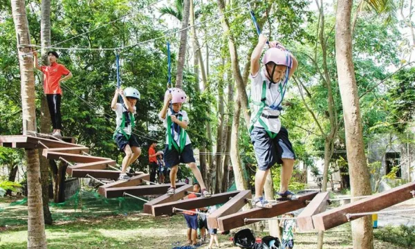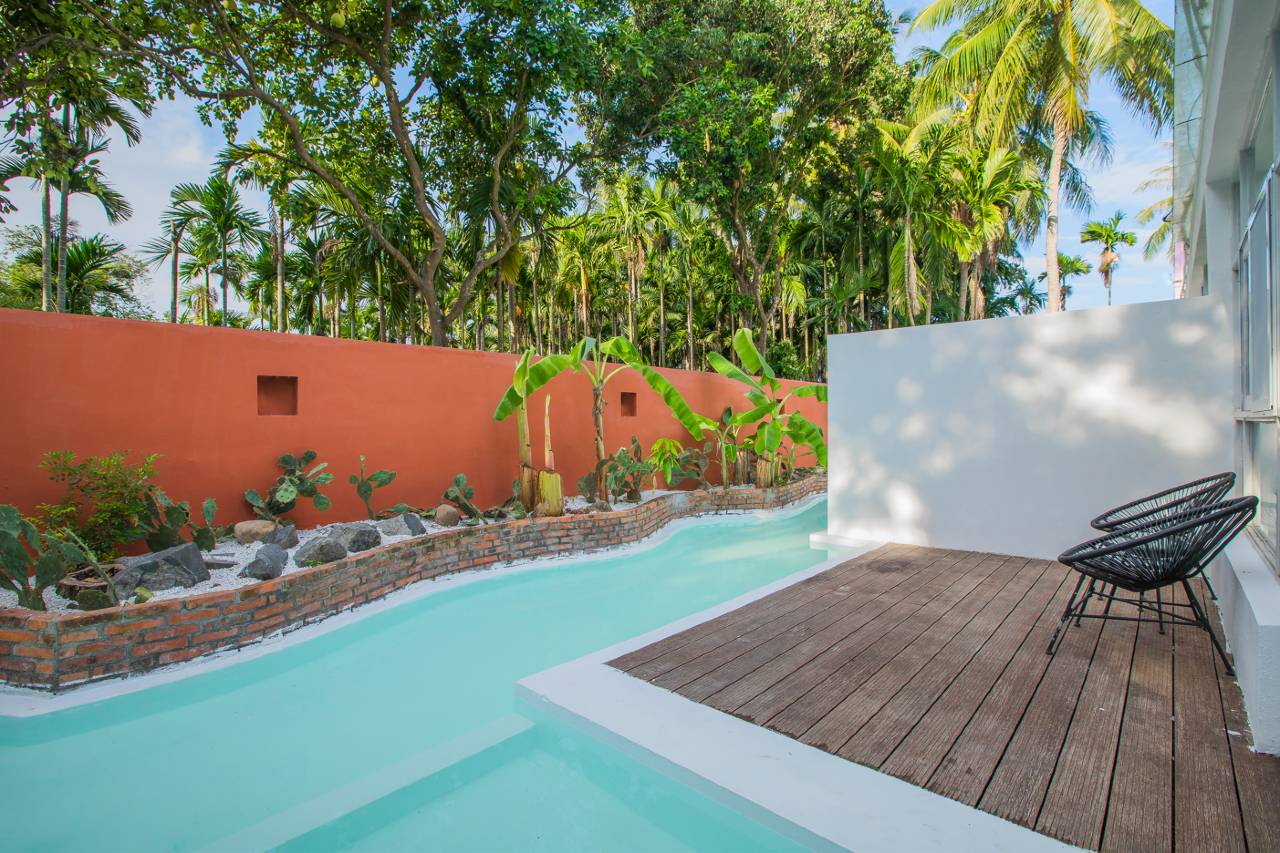 每个主题房都带着趣味阁楼与私密庭院,可满足一家四口体验。每个院子里有芭蕉树下的一对茶椅,有偷椰子的松鼠,曲水环绕的戏水池等。
