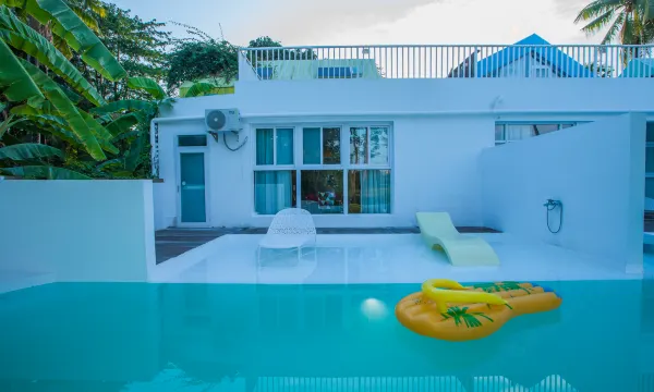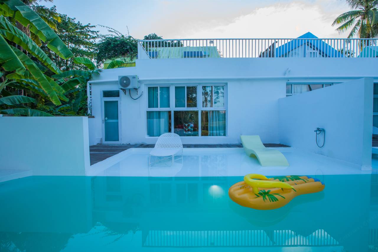 除了客房,这里还有内外公共活动区域。内有可供客人使用的厨房、餐厅、活动休闲区;外有游泳池、户外水吧,休闲长桌,滑滑梯,空中鱼缸等。适合各类派对、团建活动、家庭聚餐……