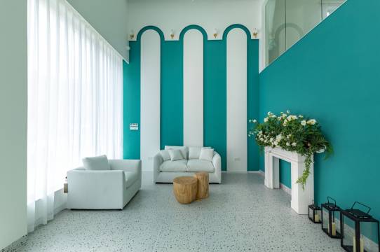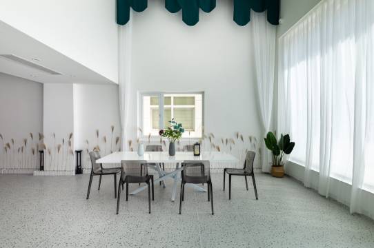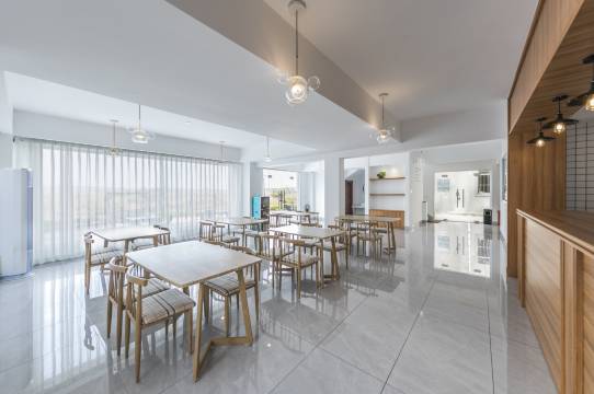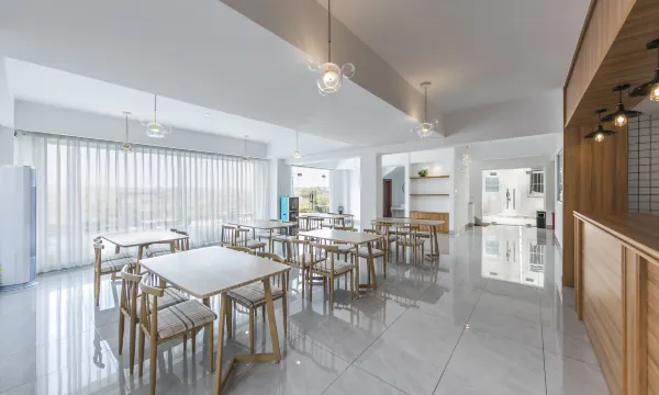 民宿独特INS白色风格。整体简约白色建筑设计风格,宽敞舒适。一楼设有餐厅、茶几及休闲桌椅及秋千椅等,饮茶闲谈,安静文艺。后院设有超大休闲庭院,可烧烤聚会。房间超大落地窗可观看养鱼虾的人文景观,室内全部装备中央空调,提供了更加舒适的住宿环境。