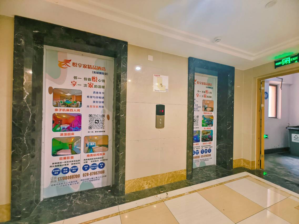 怀一份喜悦心情,享一次家的温暖! 青春年华,希望与你相遇;美好夜晚,从悦享家开始。路过一座城,遇到一个人,入住一家店,留恋一份情!以诚待人,以信做事,以“为每一位入住客户提供温暖入住体验”为宗旨。悦享家精品酒店(龙城国际店)是新装修的一所艺术多样品质商务电竞影音风格酒店。两台电梯直达客房,装修时尚淡雅,年轻魅力,环境舒适,拥有豪华商务单间,差旅标间,主题浪漫圆床,电竞房、影音房、亲子机麻等多人间,娱乐机麻,设施齐全,房间宽大安静舒适,每一件物品都是用心挑选,每个房间都是选用品牌空调,冷暖自由选择;同时部分房间配备洗衣机、燃气厨房,方便新老客户出差旅行、长住方便。酒店始终坚持以客户“住家般舒适”为宗旨,让您的每一次出行,每一次选择,都有回家的温暖。酒店位于郫都区郫都区红光镇龙城国际四期7幢公寓入口上6楼,十字路口,对面就是红光里夜市一条街,走路到6号线地铁红高路站就两三分钟,对面就是红光高铁站,紧邻西华大学南门,走路几分钟就能到红光夜市等商圈中心位置,娱乐购物、涮锅火锅等中餐西餐,应有尽有,网吧电竞电影院等设施齐全,享受繁华商圈魅力;近2号线和6号线可直达成都东站、北站等和双流国际机场、天府国际机场,也可以直达武侯祠、、锦里、宽窄巷子、杜甫草堂等网红景点和历史名迹;同时紧邻四川大学华西医院(上锦南府医院),郫都区中医院等,为您的身体健康保驾护航;周边有西华大学、电子科技大学(清水河校区)、四川托普信息职业学院、成都银杏酒店管理学院、成都工贸职业技术学院等多所大学,同时周边成都红光中学、郫都四中、树德中学等中小学,环境优雅,安静舒适;同时还有富士康等大型企业就业入住方便。入住就能感受到舒适的入住体验,周边有太平洋影城、烽火、万达、华谊等多个影城供影迷选择;更有龙城国际商业广场,各类时尚舒适的网吧、KTV等多种休闲方式;酒店也配有大空间的机麻房让您可以与牌友娱乐;配有电竞房,高速网络,畅享各种游戏;更配有影音房,会员观影,让您畅游于各个影视中。中西餐、火锅店等美食应有尽有,且部分商家与我店合作,经过一座城,寻觅一间房,入住一家店,始终以诚挚的心等您的到来,我们在这里,无论见于不见,始终等待!