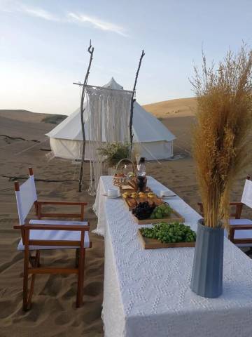 敦煌无限户外沙漠露营基地位于酒泉敦煌市鸣沙山月牙泉风景区西侧沙漠露营基地。露营基地提供专车接送服务,于每日17.30在市区接待站集中出发到达营地,不限量的啤酒饮料和各类烧烤,尽情体验热情狂野的沙漠越野摩托车,滑沙,和不同地域的伙伴们一起参加篝火音乐晚会、沙漠KTV等沙漠营地游戏,领略浩瀚无垠、最纯最净的星空和银河。第二天,感受大漠晨曦,在欣赏过美丽日出后,由专车送回市区或景区门口,结束沙漠露营体验之旅