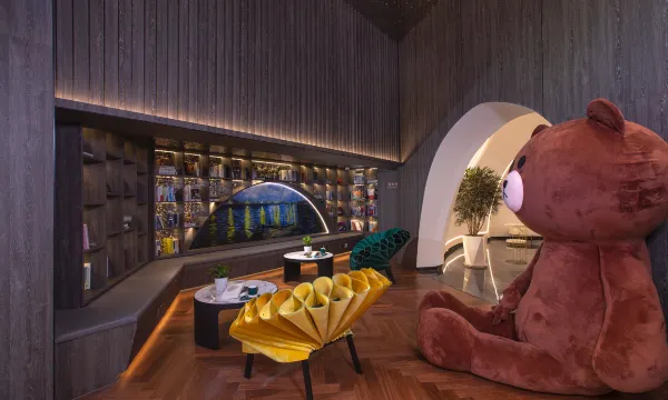 环境:酒店有配停车场,还是比较方便的。大堂环境不错,有小朋友拼积木、看书、玩偶拍照打卡的区域,也有休闲喝咖啡的区域,设计得很好看,品味在线。隔壁就是老网红“小眼镜大排档”,附近就是禾祥西路,有很多很多的美食,觅食很方便。