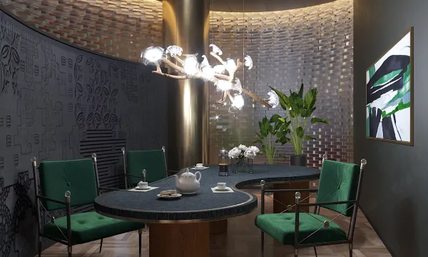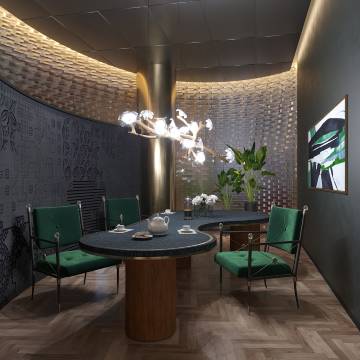 公馆采用英伦精致优雅风设计,以黑色和木色为主基调,选用墨绿色跳跃点缀,整体大胆配色与柔和灯光刻画的层次感相融合,凸显个性的同时营造着精致优雅的氛围。进门的网红艺术墙设计突破空间思维,由数个颜色鲜明及精心设计的茶罐拼凑而成,呈现出一个别致的空间,充满着浓浓的艺术气息。