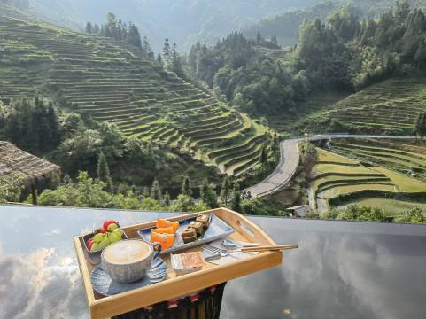 酒店在景区里,整体感觉超预期,庭院绿化漂亮,接待厅、客房、餐厅、咖啡厅景观都很漂亮,屋顶还有观景台和一座装饰的非常漂亮的秋千,赠送的下午咖啡糕点也不错,房间里干净整洁,设施很新,阳台上观景很舒服,大概是加榜梯田景区里最好的酒店之一。