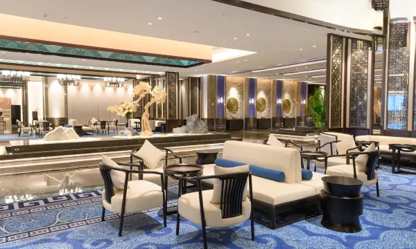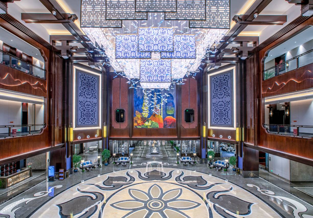 酒店大堂面积达4500余平米,是织金饭店独具魅力的网红打卡点,中空3层,总高达21米,地域文化色彩浓厚,体现“中国风”之中的纯正“织金味”。