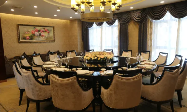 酒店中餐厅位于3楼、5楼,共18个豪华包厢,餐厅装修格调高雅、设施一流,拥有供500余人同时就餐的宴会大厅和各式豪华宴会单间,酒店宴会大厅富丽堂皇,包厢与大厅视听同步,为婚宴宾客提供尊贵享受。酒店特聘高厨精心烹饪,为您提供独具特色的各系菜肴和特色风味小吃,让您驻足品尝,一饱口福。6楼早餐厅,豪华时尚、环境优雅可以同时容纳150人就餐。酒店门前及地下三层停车场,共有车位150余个,并配有电梯智能系统能为您的爱车提供直达泊车服务。