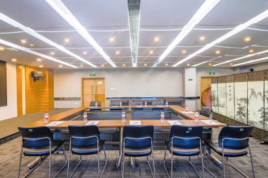 会议室位于酒店3层,会议是最多容纳100人,凡租用会议室的顾客均可免费使用会议室的标准试听设备、投影仪、麦克风等。酒店免费提供会议期间的茶水服务、纸笔、写字板、指示牌、签到台等。良好的环境,优质的服务是您中小型会议的成功之选。