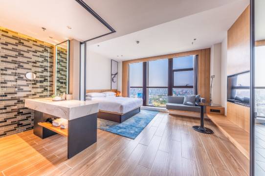 感谢携程和前台小哥用权益顺利升房,开间大床房入住比想象中要大很多,布局也很舒服。我住的是高层,窗外视野绝了~晚上看城市夜景超有感觉,拍照也很出片!