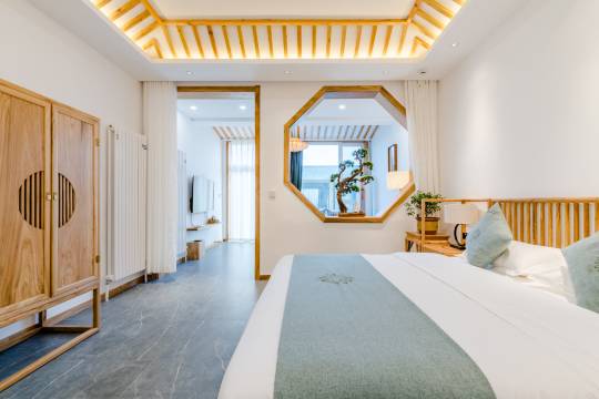 民宿房间坚持使用的百年树龄老榆木家具,均为古老的卯榫工艺实木定制;床上使用泰国Laytex乳胶枕,80支贡缎床品;还配有进口Soocas负离子吹风机,全自动智能马桶,法国SIVIA洗护套装,并配有日本全套吉谷茶具,为您的入住体验带来温暖、轻奢的感受!