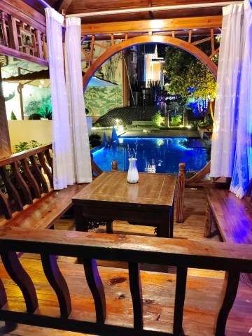 酒店环境,不夸张的说,是我住过的民宿中,绝对排前三的。小院的茶台,花木和水景,都极尽雅致,相映成趣。从茶室观鱼,从门口看花木,都有不同风景。更难得晚上灯光映衬,从我住的3楼看下去,黄金白银锦鲤憨憨地游动,很有仙侠片的意境。