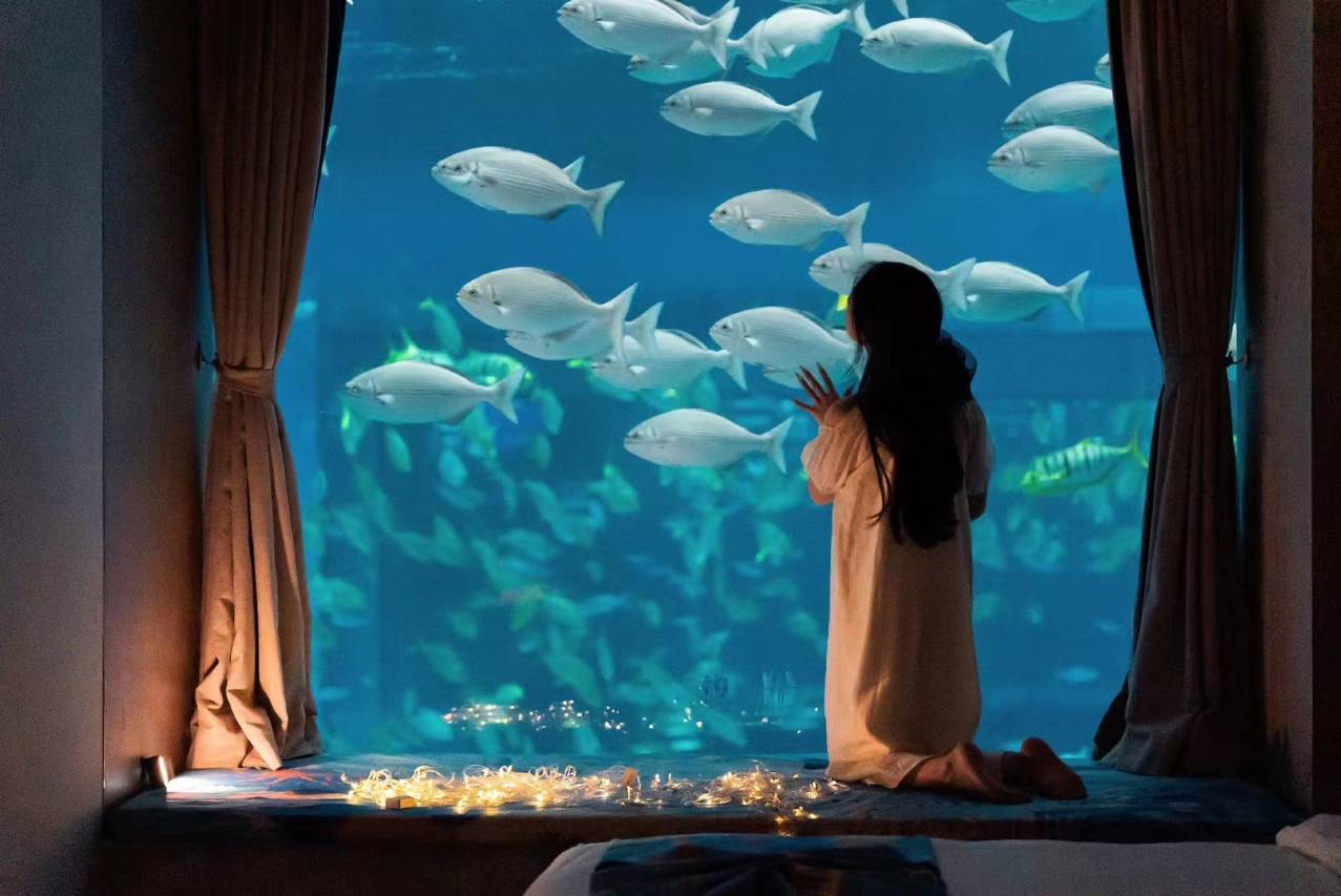 房间绝对是亲子带娃的天花板,是孩子们一次非常特别的体验,一定要去海景房,美人鱼会来窗户跟前互动