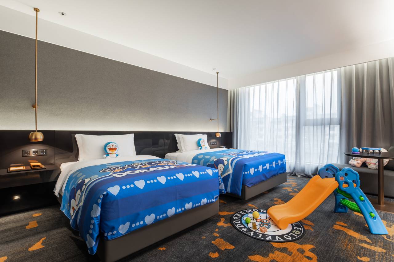 亲子房间内设一个大床一张小床,一家三口住太适合了,还有小马玩偶和小朋友们喜欢的帐篷。干湿分离的卫生间方便一家人使用。