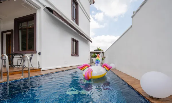 民宿是一家位于莫干山景区外的全新精品民宿,地处5A风景区莫干山山脚下。独栋别墅,各个房均有不同特色,院内设有泳池、儿童游乐区、烧烤区、休闲区等,这里配备供泠暖水系统24小时热水充足,中央空调、浴缸,一次性用品皆是高品质。旅游集散中心和民国风情小镇步行可到,交通便利,空气四季清新,常年蓝天白云。这里远离都市尘嚣,独享清静。可举办各种party、酒会,是家人朋友休闲度假,公司小规模聚会的好去处。