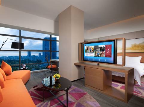 酒店位置绝佳,工作人员服务热情,房间设施很干净而且物品齐全,孩子特别喜欢,早餐品种丰富,wifi网络很快,有专属停车场有充电桩!离山姆很近。