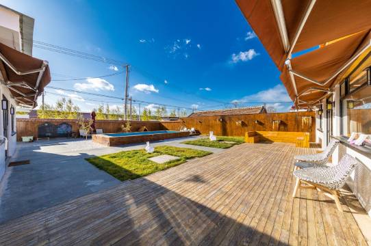 我们的民宿坐落在一个自然村落里,这里有古老的戏台,小寺庙,有自然淳朴的乡里乡亲,有在院子里就可以看到的冠帽山峦,有带着老宅记忆,带着原木自然设计风格的新宅新貌。