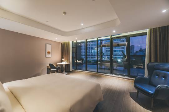店员服务热情周到,还给免费升了房型,服务响应及时,房间干净卫生。早餐也不错。店前打车上下车都很方便。