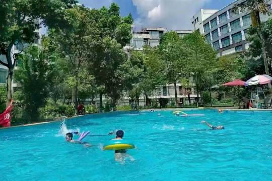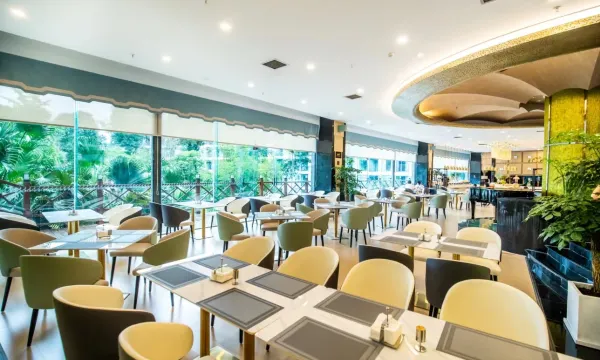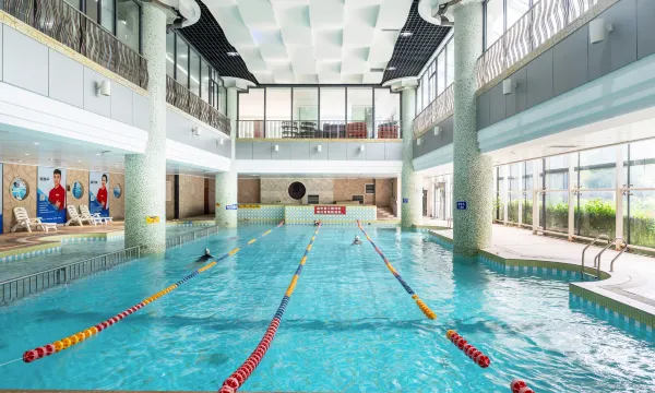 酒店建筑风格独特,历史文化厚重。酒店装修风格轻奢现代,简洁清爽,功能丰富,设施齐备,拥有大型地面停车场,室内外游泳池,入住客人可免费游泳、健身,自助早餐品种丰富、营养可口,为您提供一场轻松惬意的旅居体验。 酒店地处广安城区主干道五福西路和金安大道交汇点,交通便利,毗邻红色旅游景区、红色影视城、市民广场、思源广场等,距国华蓥山旅游景区1小时车程,距广安南站仅10分钟车程。 酒店占地 65 亩,绿化面积达 40%,环境优雅。