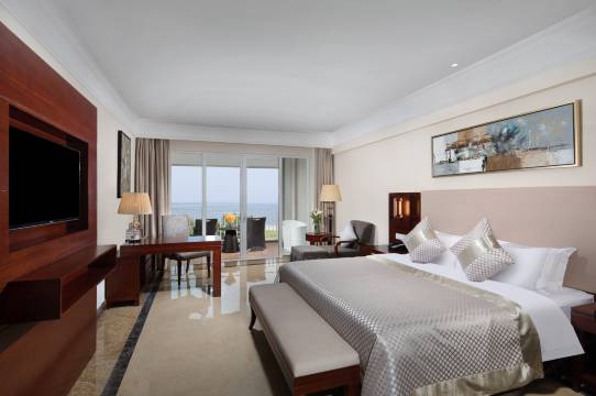 五星酒店名副其实,海景房180℃视野,海边的沙滩可以去走走,就是一般了点。