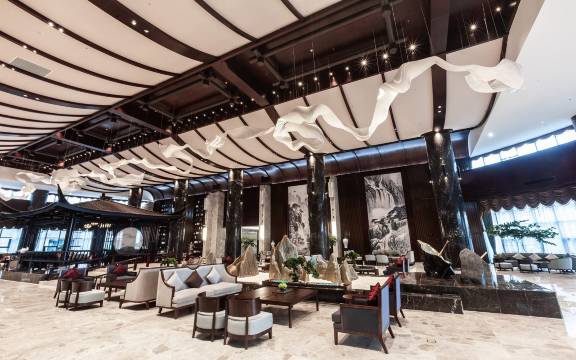 坐落于风景秀丽的芙蓉湖畔,毗邻九华山。酒店设计融合了当地山水与佛教文化,大堂典雅大气,充满艺术感。客房舒适,湖景房视野开阔,餐饮选择多样。娱乐设施齐全,是度假或商旅的优质选择。