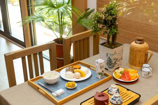 两大两孩(初高中生),两张单人床,一张大床,悦怡房最适合不过了,干净卫生不说,还很温馨,早餐营养健康,太适合了。图一是四人餐,不吃玉米红薯那些的爸爸主打一个鸡蛋三碗小米芡实粥,每个人都光盘光盘。早餐后水库边木栈道散步,收获一小盒子螺蛳和一大片美景,可以通往涵田度假村,很方便~~