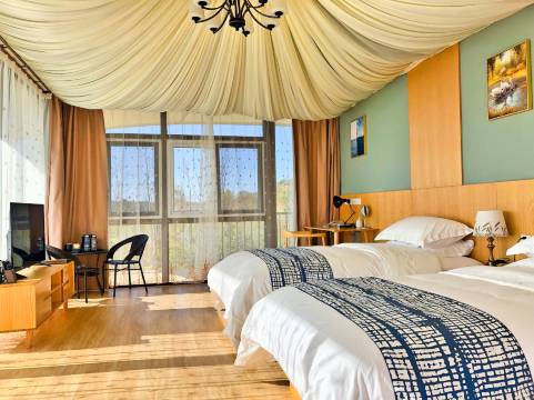 房间很惊喜,宽敞明亮,一点不潮湿。干湿分离,使用很舒适。环境特别好,三面环山,园区内很安静,满眼绿色,帐篷错落有致,如福画。早餐也特别好,还能使用儿童游乐场,看森林图书,打台球,乒乓球,淘气堡。