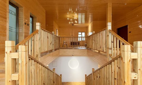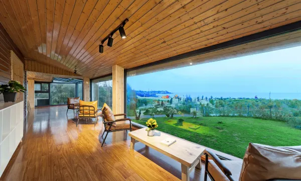 民宿内以屏风的分隔来集中视线,同时中心布置妈祖文化格局,以石材团圆随行而仰望,新东方式吊灯环绕在中心上方,虚实结合,返璞归真,营造东方禅意之境,全景式落地玻璃,让阳光透过木屋建筑洒进屋內,留下斑駁光影,蓝天碧影,绿木成荫。公区场地内外的点状式集中处理,在过渡性空间以木屋台阶结合无边玻璃的形式进行消解,营造层叠下沉的园林景观空间。在公区穿行漫步在地植被园林景观,虫鸣鸟叫,鱼鳞波漾,恍若梦境。部分客房建筑与园林相映衬,打造花园式极简前场,原始与现代的混合,卻又如此和谐。房间内部通过结合松木的色调进行整体设计,潮流家具的点缀将整个房间空间的氛围形成时尚而不张扬的气质,全海景落地窗,入住观海,依海而眠。