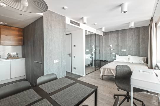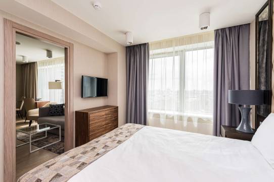 客厅大片窗户,外面视线非常好,厨房餐具一应俱全,每天做饭吃。床很舒服,酒店地理位置绝佳,到克里姆林宫很近,走路约 10 分钟