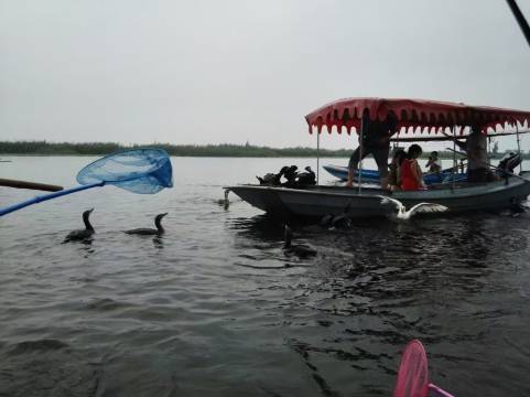 争渡争渡,惊起一滩鸥鹭。苇淀深处,荷花盛开,美 不胜收。维子农家院,干净整洁,老板炖的 鱼,鱼肥汤浓,还有老板娘亲自下厨烙的玉米饼,沾鱼 汤吃,吃了三个饼。帮我们定的船长,在芦苇荡辛 苦用竹竿撑船,采摘了荷叶莲蓬,新鲜的莲蓬吃起来 甜滋滋的。不虚此行,在此感谢感谢,下次带父母来。