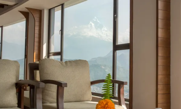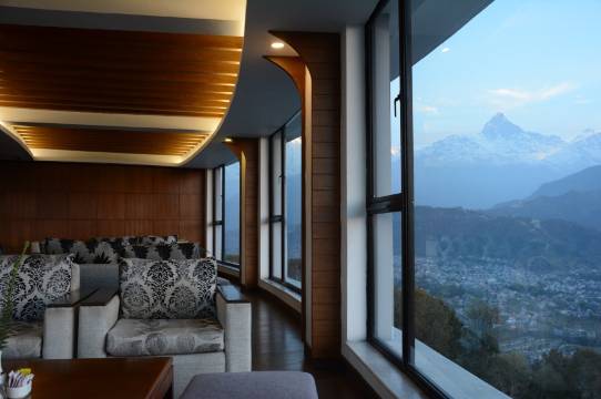 酒店在山上,出租车费需要花点银子,但酒店的景色很好,从房间里躺着就能看到尼泊尔神山鱼尾峰,也是非常惬意的享受!