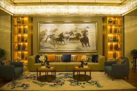 环境:酒店融合传统纹样与现代简约设计,大堂水幕墙潺潺水声,夜晚城市灯光映衬房间落地窗,仿佛置身西域画卷,安静且充满异域情调。
