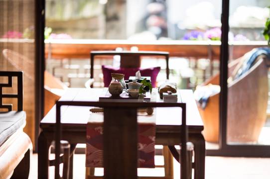 一楼白天对外是茶社,2楼房间,不大,有一个阳光房,外面还有一个临河的阳台。晚上7点后整个2层就都是住客的了。