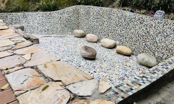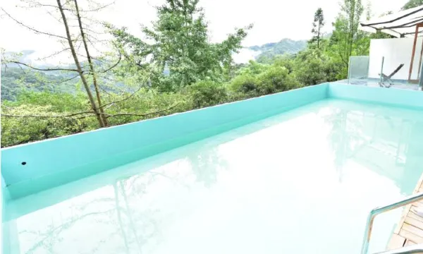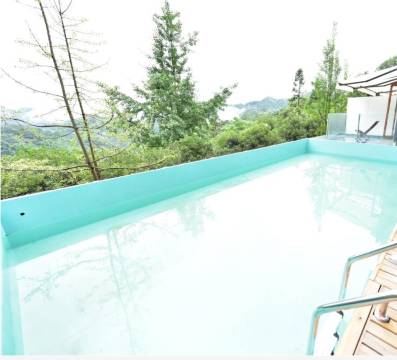我从青城山下来之后直接打车过来,不到半个小时就到了,就像评论说的拐进来的这个坡是有一些陡峭但是还好,司机很稳当的开到了停车场。这里有泡温泉的水池,可能因为天气热,现在还没有开放,但是看得出来是可以泡温泉,而且泡温泉的地方正对着大山,如果冬天下着雪来泡下一定很舒服。