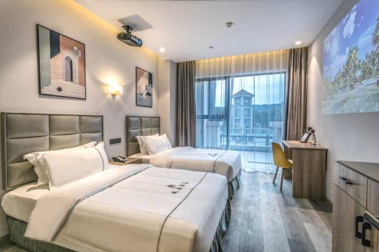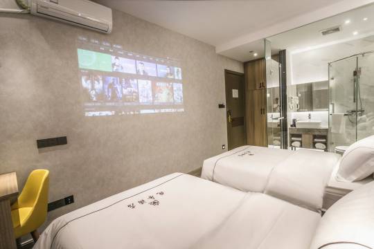 前台服务特别棒,有求必应。酒店门口还有秋千和打卡。酒店环境很好 干净卫生。房间是中央空调,床很舒服,房间也很干净,还有一个投影仪,特别适合晚上看电影。离商场很久,几百米的距离,交通很便利,附近也有地铁,在大学城附近,这个价位真的很棒。