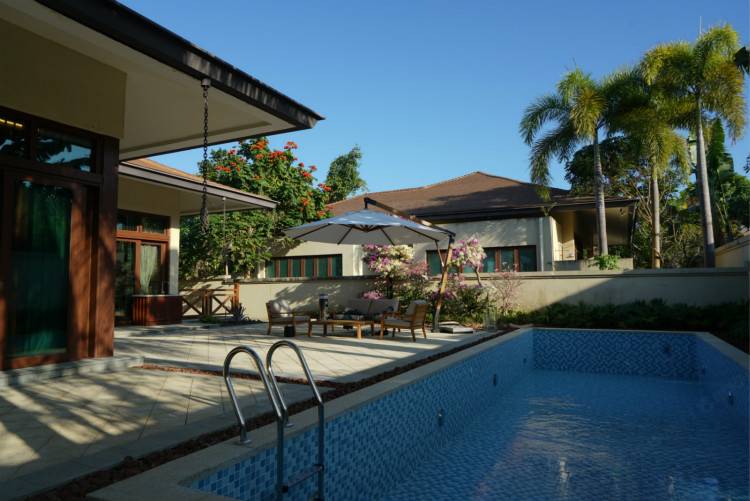 美域海湾度假别墅位于海南清水湾,湾区海水清澈沙滩柔软号称全球三大会唱歌的沙滩。湾区距三亚机场45分钟车程到达别墅,住客可以在机场租车自驾到达,机场有神州租车网点有摆渡车接送到办理点办理租车手续。湾区有亚洲前列的游艇会、三个标准18洞球场,周边20多分钟车程内有南湾猴岛、椰田古寨、新村鱼港、三亚免税城、亚特兰蒂斯、南田温泉、蜈支洲岛等景点设施。美域海湾度假别墅是以私人别墅改造而成,每一户都能驾车到达进出方便私密性比较好,别墅都是泰式风格210-320平米2-4房不等,有客厅厨房餐厅。别墅庭院景观比较精致有水系或泳池。别墅会所:音乐餐厅、下午茶、大游泳池、天然温泉泡池、SPA等设施(别墅会所的单项筹建中敬请期待,预计2019年底前分项逐步投入使用,早餐、下午茶、天然温泉、泳池供住店宾客免费使用)。