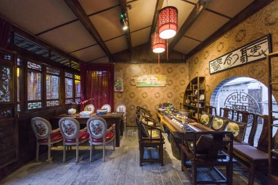 客栈由老板精心打造,天然假山、古鱼缸、流水潺潺、雾气缭绕、花草繁茂,从早到晚沐浴温暖阳光,古筝乐曲幽幽环绕,恍若置身瑶池仙境。